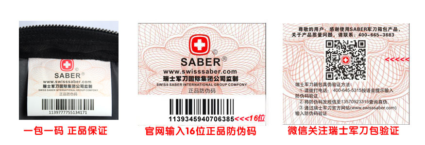 (商标是SABER中文译为军刀才是我司产品,请认明注册商标R标识和版权登记C标识)请消费者提供16位正品防伪码进入瑞士军刀包商品防伪查询中心核验,也可以进入瑞士军刀集团代理商查询中心核查销售代理商资料。
